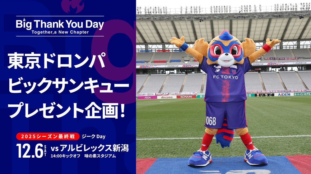 為紀念2025賽季的最後一場比賽所舉辦的『Big Thank You Day』,將實施TOKYO DOROMPA的贈禮企劃。贈品除了TOKYO DOROMPA糖霜餅乾外,還將限量39名贈送TOKYO DOROMPA親筆簽名的大尺寸徽章。敬請務必於2025賽季的最後一場比賽來見TOKYO DOROMPA!!