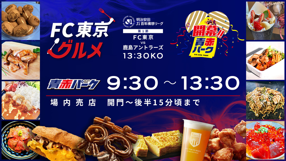 2月7日(周六)明治安田J1百年構想聯賽第1節 vs 鹿島Antlers(13:30開踢/味之素體育館)的AO-AKA PARK(場外)、出張!! AO-AKA PARK、體育館內走廊(場內)販售攤位的飲食資訊通知您。