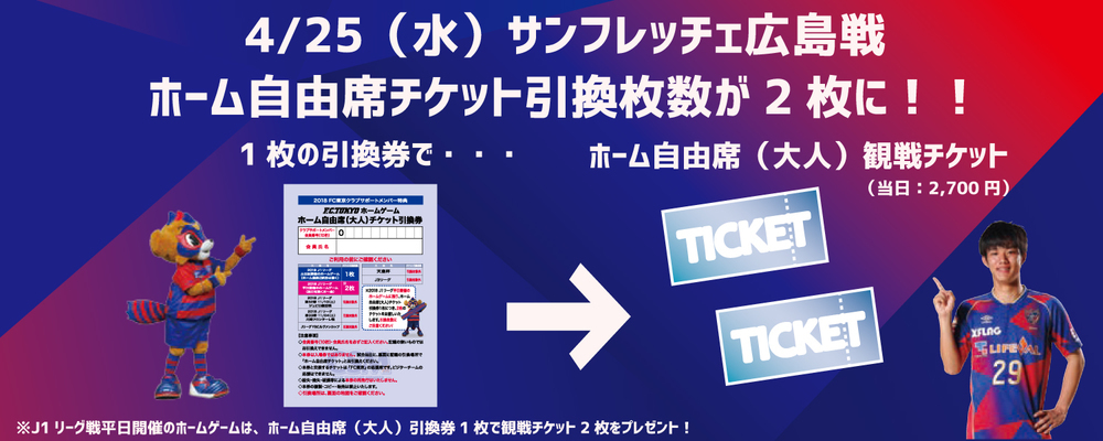 4/25(周三)2018明治安田生命J1聯賽第10節對Sanfrecce廣島戰(19:00開球/味之素體育館)的當日票販售,現公告如下。