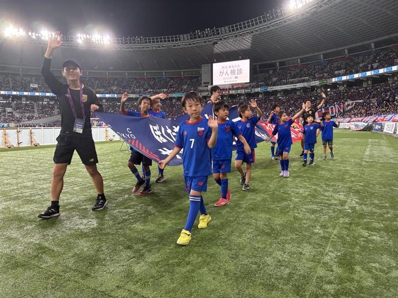 中場休息時,正在就讀FC東京足球・室內足球學校的二年級和五年級學生,手持FC東京足球・室內足球學校的橫幅繞場一周!